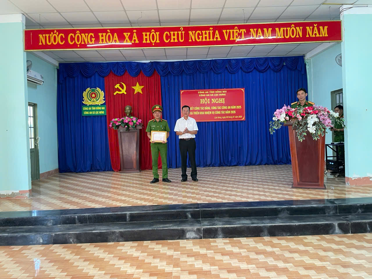 Đồng chí Lý Thanh Tâm - Tỉnh uỷ viên, Bí thư Đảng uỷ, Chủ tịch Hội đồng nhân dân xã đã trao tặng giấy khen của Đảng uỷ xã cho Chi bộ Công an xã đạt tiêu chuẩn “Hoàn thành xuất sắc nhiệm vụ” tiêu biểu năm 2025