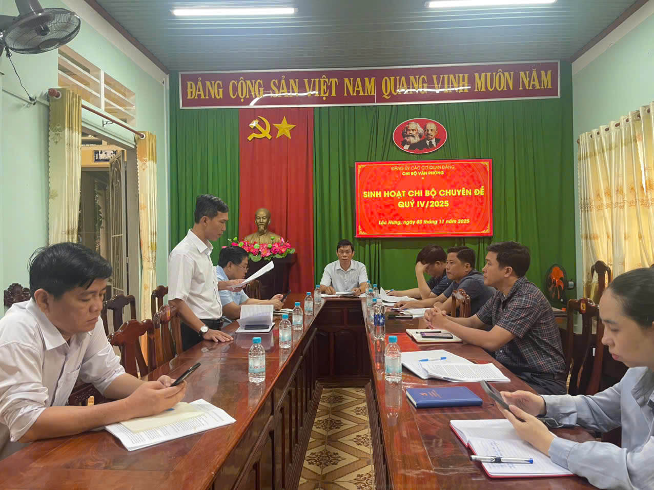 Tại đợt sinh hoạt tháng 11 năm 2025, Chi bộ Văn phòng Đảng ủy xã Lộc Hưng tổ chức đợt sinh hoạt chuyên đề về “Nâng cao chất lượng công tác tham mưu, tổng hợp, cung cấp thông tin phục vụ sự lãnh đạo của Đảng ủy xã”.